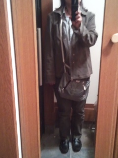 お気に入りのグレーのストンとしたロングコートに通学帽みたいな形の黒い帽子、使い捨てマスク。あやしいなぁ。