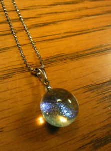 写真はガラスアクセサリーのお店で買ったネックレス。光の角度によって印象が違って見えて素敵です。