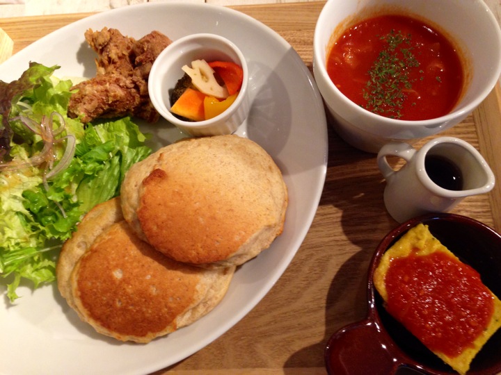 写真はお昼にビーガン料理のお店でいただいた、全粒粉パンケーキのランチセット。