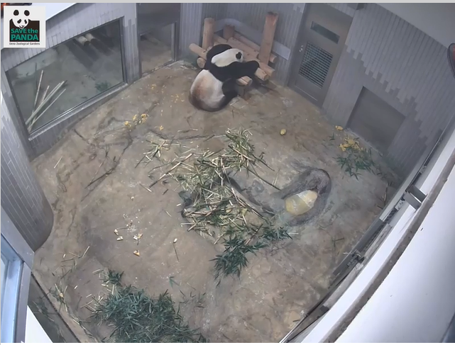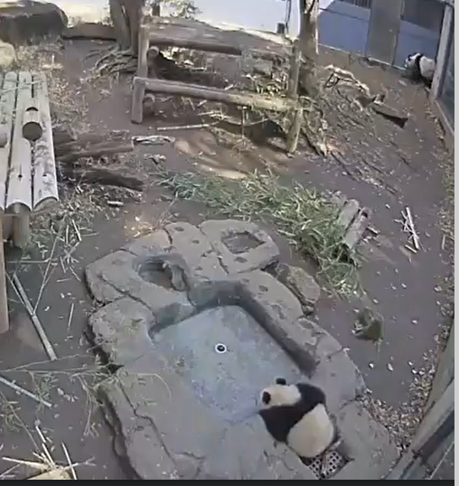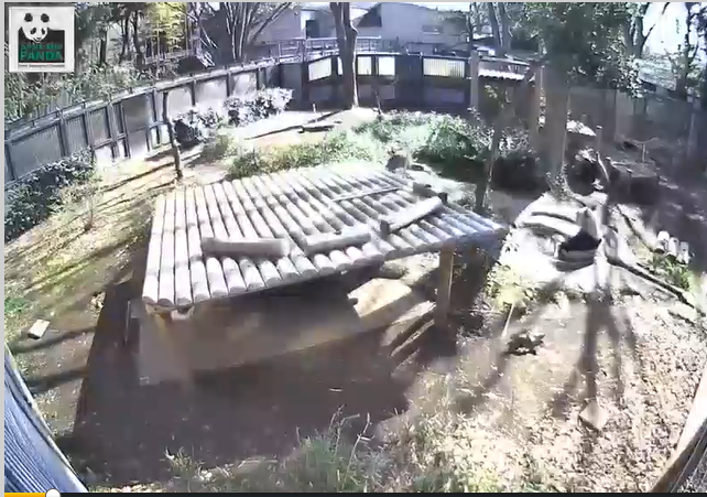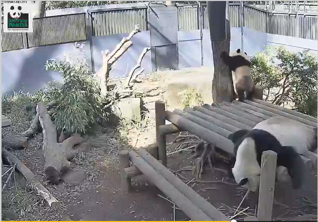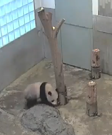 シャンシャンはついに木に吊した麻袋を触っていました。すぐ飽きちゃったみたいだけど、いつかそれにつかまってワーイ♪って遊んでるシャンシャンが見れるといいなぁ。飼育員さんのアイディアが実を結びますように。
