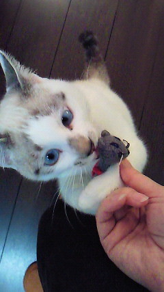 「ほぅら~ネズミ君だよー」ガブッ!やっぱり食い付くよね。