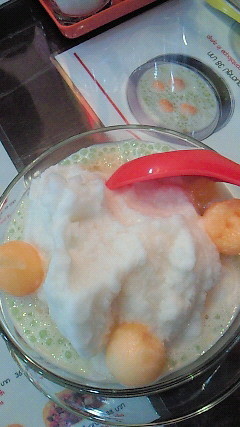 タピオカにココナッツのシェイクが山盛り、メロン入り(冷たい)