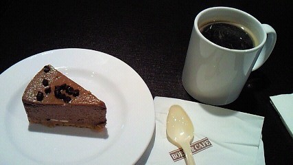 ゲート近くのカフェでチョコレートケーキとコーヒー。