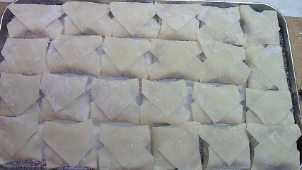 ワンタンの皮にしたけど、シュウマイの皮でもOKかも…。