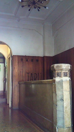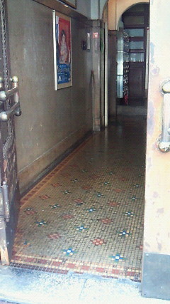タイルの敷き詰められた廊下、奥には手動のエレベーターがある。
