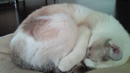 普段から猫らしく丸まる寝相が不得意な うちのブルー。
