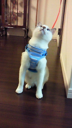 とってもご不満な顔つきですね。でも首輪だと無理矢理外して危険だったしー