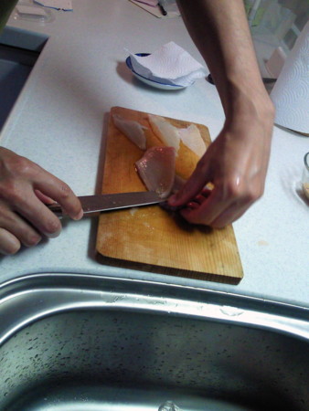 (ダンナが作業中、薄い魚を下ろすのは大変だねぇー)