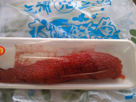 漬け汁に入れて一晩、明日の晩ご飯は「いくら丼」予定です♪