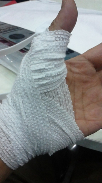 ビッグサイト着。コンビニで包帯を買ったけど、ハサミがないから、絆創膏はグロいまま。