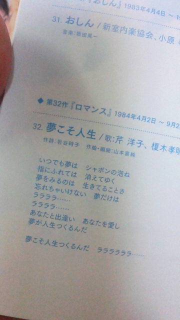 歌詞つきのオープニングはこれが初めてなのか…前年が、日本中を陰惨にした(笑)「おしん」だったから、思い切ったんだろう。実はこの歌、うるっとくるくらい好きで、頭に残っていた。