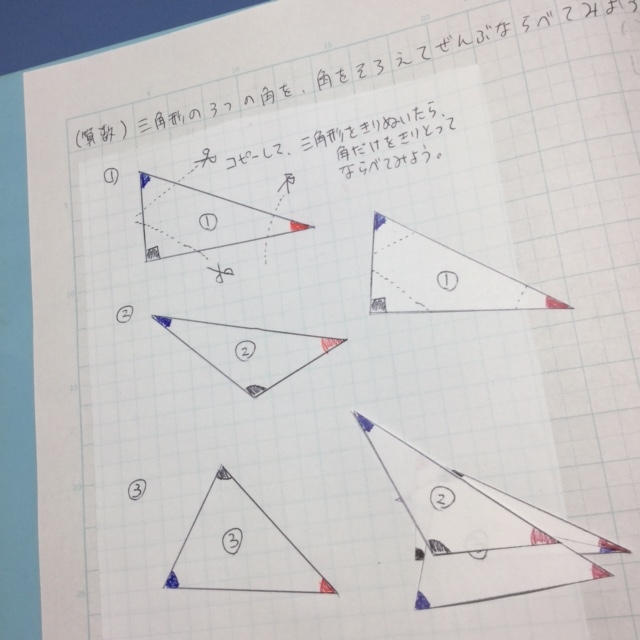 娘に、「三角形の内角の和が常に180度になる」ことを紙工作で示したら、食いついた。自分でもやりたがったので、学校指定の自学課題ノートに作ってみた。これで課題1回分助かった。もうけもうけ。