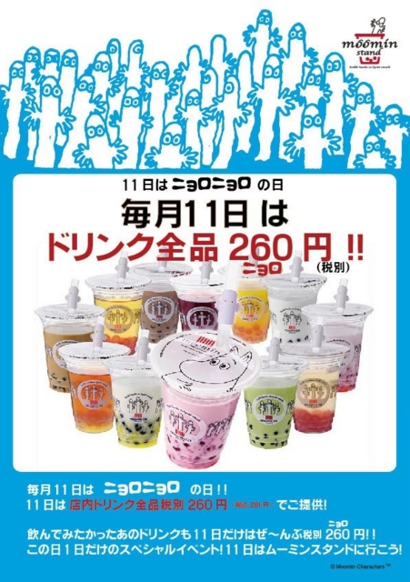 毎月11日は、「ニョロニョロの日」で、このタピオカドリンク「ニョロニョロのたね」が安く飲めるらしい。期間限定品まで安いかはわからない。