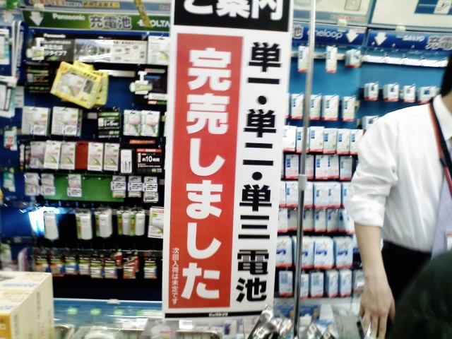こちらでも、カセットコンロ、懐中電灯、単1、2電池、充電池が既に売り切れ。