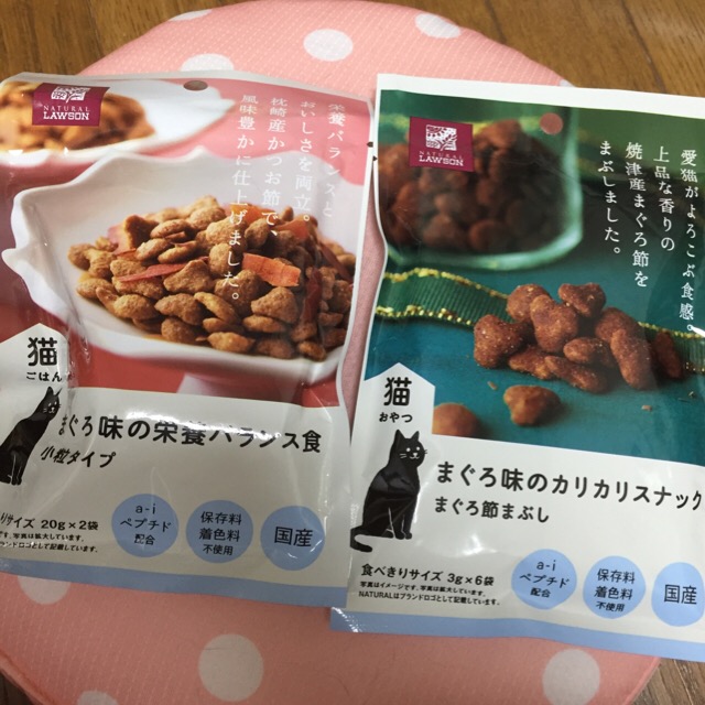 ハイクで見かけたこれ、どうしてもうちの猫たちにあげてみたくて、職場から行ける範囲のローソン3けんまわって、やっと手に入れましたー!