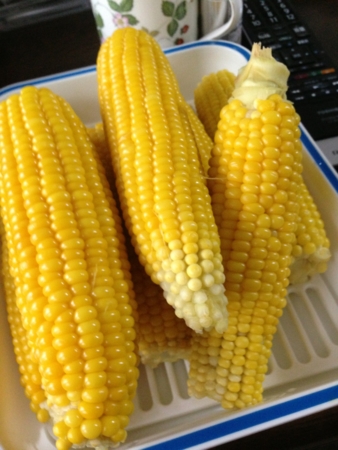 今日のいろいろな仕事を終え、まめ夫さんは隣町での仕事で遅いし、アルコールも入って、とうきび茹でるのめんどいよー。