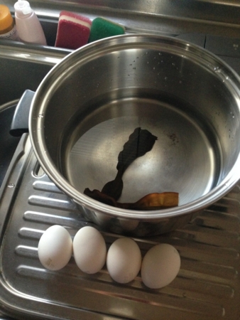 鍋の中に水と昆布を入れてゆで卵を作りました。