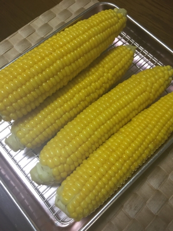 もぎたてトウキビを茹でたのを保冷剤を入れて1本友人に持ってきました。