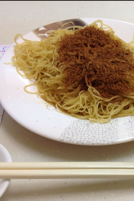 (海老の玉子を炒ったものを振りかけた香港の焼きそば。
