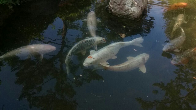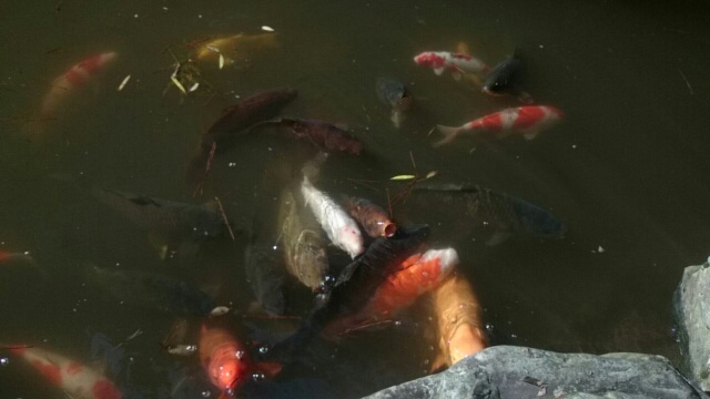 池がふたつあるんだけど、どっちの鯉も人影で餌がもらえるってわかってるからスゴい勢いで集まってくる。
