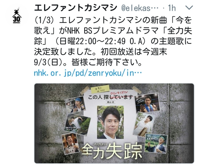 9月3日スタートのBSプレミアムのドラマ『全力失踪』の主題歌がエレファントカシマシの『今を歌え』です。