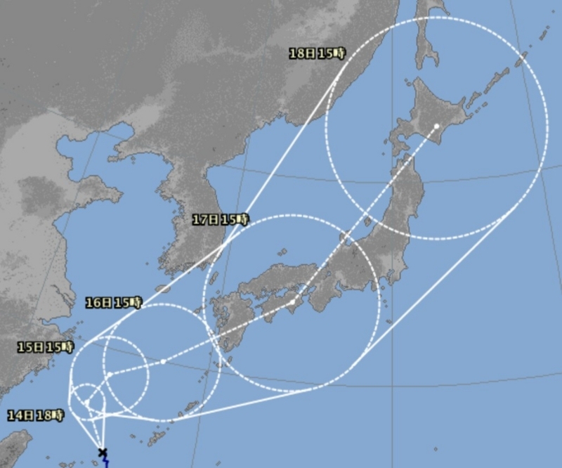 昨日の時点では関東直撃な感じだったけど、スピードが早いのか今日の予報では18日はもっと北の方に進むみたい。
