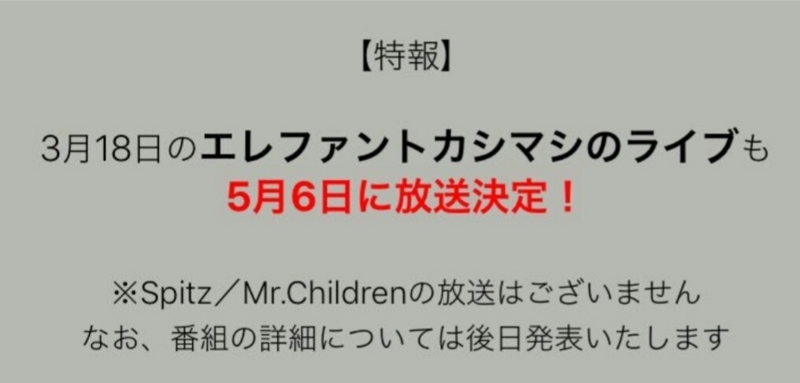 先日のたまアリでのエレカシ・スピッツ・ミスチルの夢の競演、WOWOWが5月に放送してくれるのはエレカシのライブだけだそうです。。。