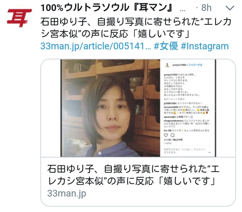 石田ゆり子さんがインスタに上げた自撮り写真がエレカシの宮本さんに似てると話題になってるそうで。