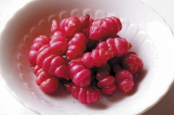 紫蘇科の植物で、紫蘇漬けするんで赤くなり、歯ごたえはかりかりした梅干しだから、小梅を食べている感じ。