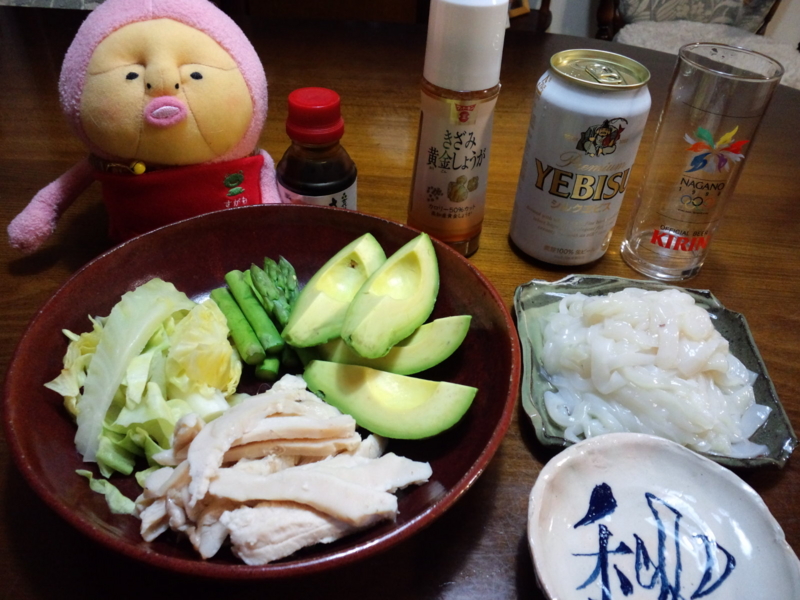 生するめイカが5杯で298円だったので、イカそうめんに。塩糀に漬けていた鶏を蒸して、蒸し焼き野菜と一緒に、いただきます。
