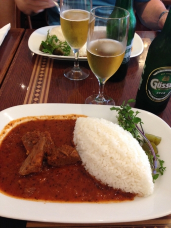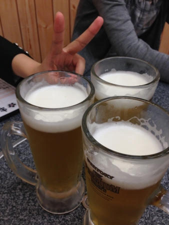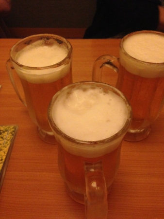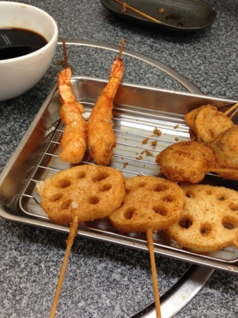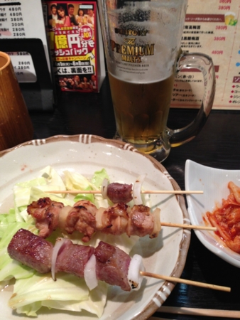 ホテル近くの居酒屋さんのカウンターで牛串、焼鳥を食べながら。