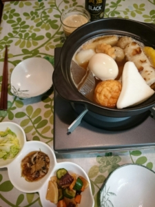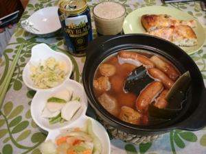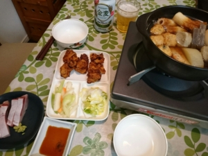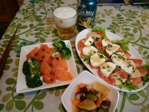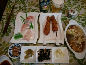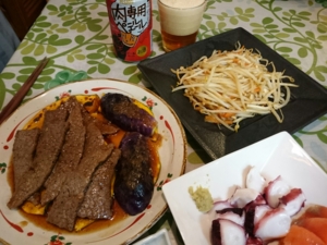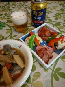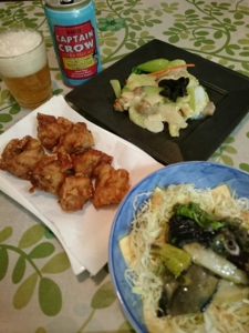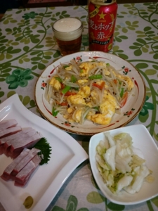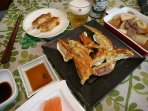 餃子・煮物・サーモンの刺身。何でも合うねぇー♪(*´∀`)♪