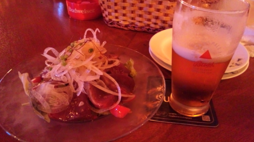 バス ペールエール(飲みかけ)と新玉ねぎとカツオのサラダ仕立て@Kitchen Bar Braise (Link)