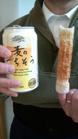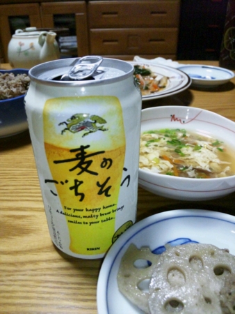 蓮根のきんぴらを肴に新製品の麦のごちそうをいただきます。