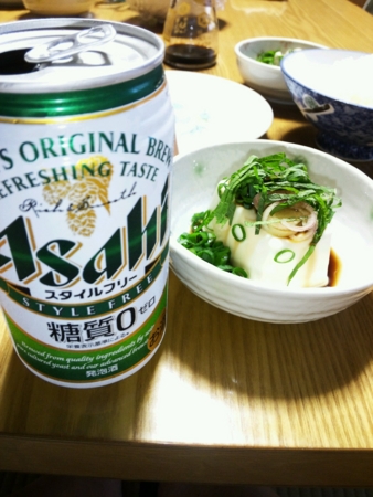 豆腐が隠れるくらいネギとシソとミョウガをのせた冷奴を肴にスタイルフリーをいただきます。