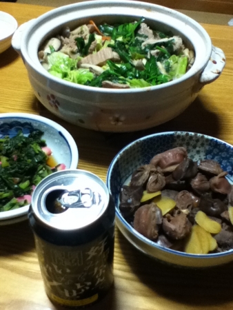 もつ鍋、鶏レバーと砂肝の甘辛煮、菜飯用の大根葉煮浸しを作りました。