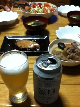肉じゃが、鰤の照焼き、ほうれん草のおひたし、コールスロー、味噌汁を夫婦で作りました。