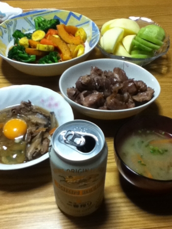 牛皿は昨夜の残り。嫁さんがフルーツを切って準備OK。