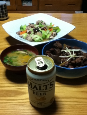 鶏もつ煮、青梗菜と豚肉の中華炒めを作りました。