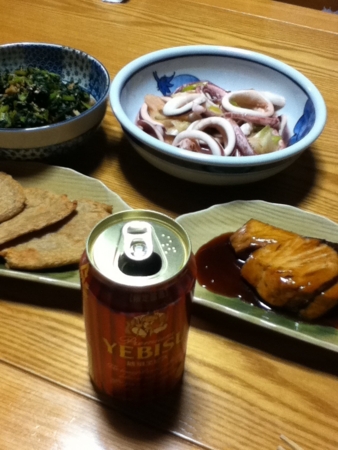 大根葉とじゃこ天を炒めた菜飯のもとを肴に琥珀ヱビスをいただきます。
