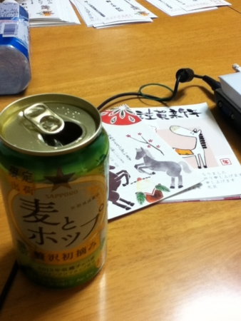 届いていた年賀状に目を通しながら麦とホップ 贅沢初摘みをいただきます。
