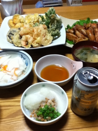 天ぷら、手羽揚げ、大根の煮物、おろし納豆、蕪の酢漬けに味噌汁。
