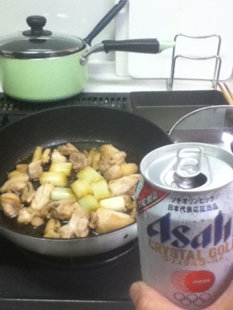 焼き鳥を作りながらアサヒ クリスタルゴールドをいただきます。