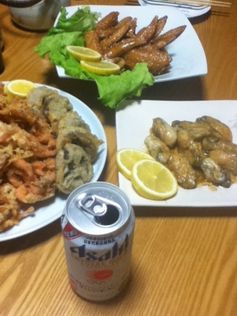 手羽揚げの甘辛だれ、牡蠣のソテー、地海老の唐揚げを肴にクリスタルゴールドをいただきます。