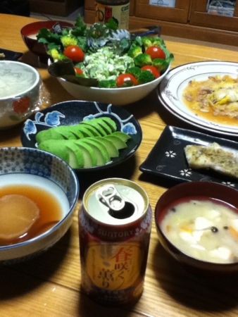 さっき取ってきたばかりのキャベツで作ったコールスロー、タラのスパイス焼き、アボカドなどを肴にサントリー 春咲く薫りをいただきます。