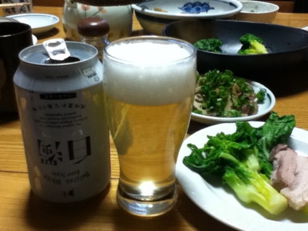 白菜の花芽と豚肉だけのシンプルな鍋、昨日の牛すじ煮込みにはるさめを入れて増量、塩麹に漬けておいたブリカマ焼を肴にシャインモルトをいただきます。