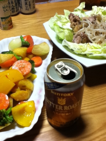 鶏肉ともやしのスパイス焼き、ごろごろ野菜のオリーブオイル炒めを肴にビターロースト 大人の深煎りをいただきます。