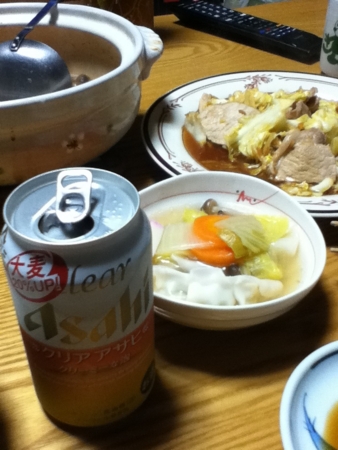 豚肉とキャベツの生姜焼き、昨日の鍋の残り汁で白菜スープ餃子を作りました。