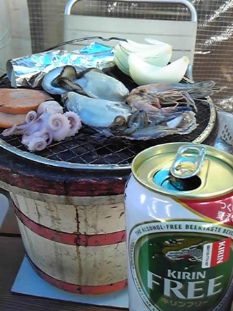 長ネギと焼き鳥、野菜の天ぷら、コールスローを肴にニッポンラガー プレミアムをいただきます。