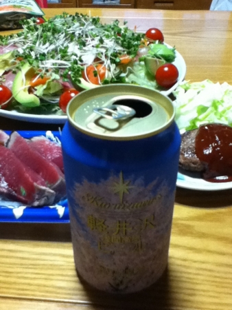 カルパッチョとハンバーグと鰹のたたきを肴に浅間高原 軽井沢ビール 桜花爛漫 クリアをいただきます。